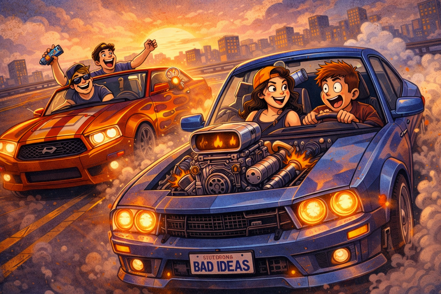 PLOT: A group of thrill-seeking friends take their heavily modified cars into late-night street races, pushing limits for fun, clout, and chaos. What starts as friendly competition quickly turns into unpredictable mayhem when their “bad ideas” spiral out of control.