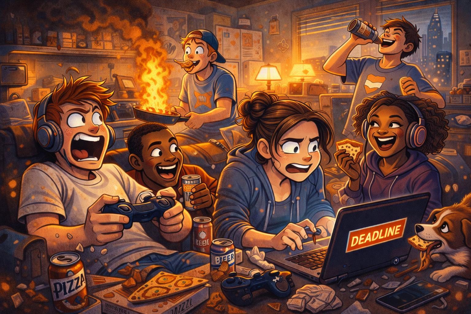PLOT: A group of creators try to finish a major project before a looming deadline, but distractions, gaming, and pure chaos take over. As pressure builds, their productivity crashes into comedy, forcing them to either lock in… or completely fall apart.
